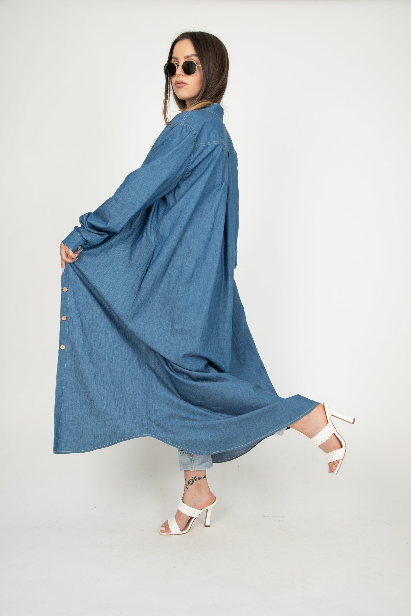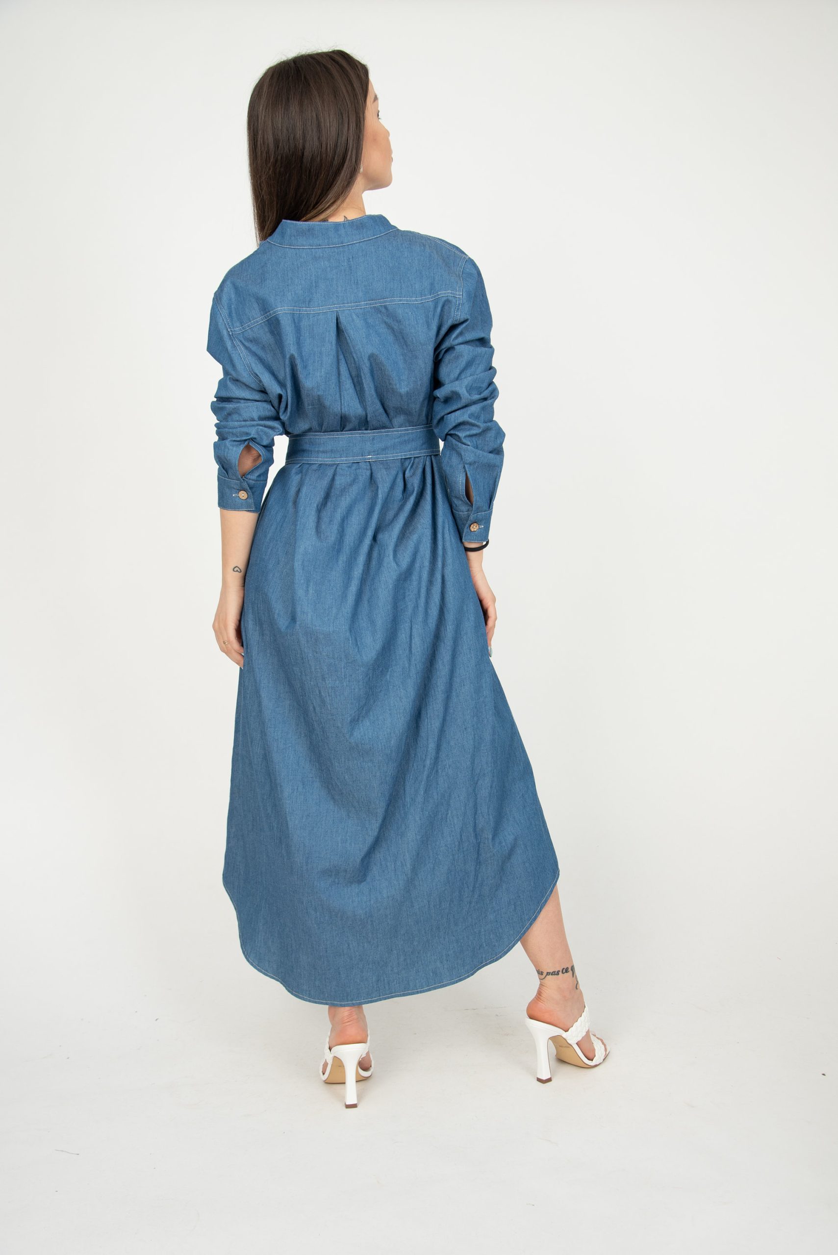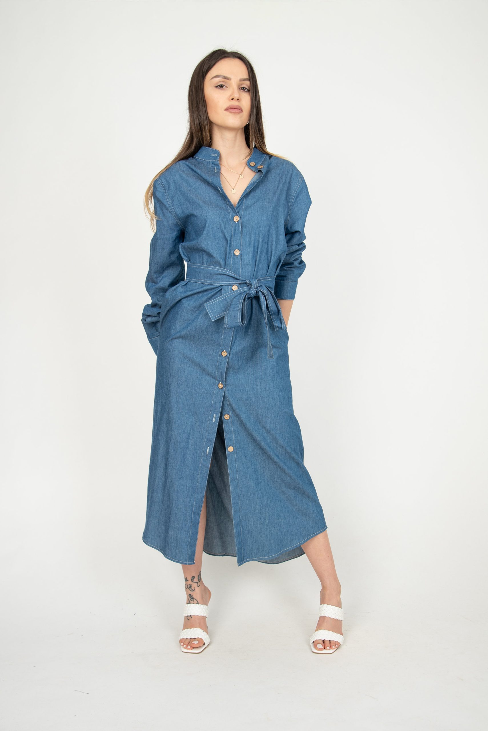 A timeless wardrobe staple with effortless polish, this denim shirt midi dress blends classic structure with easy comfort. Designed with a collared neckline and full button front, it features long sleeves for year-round wear and a self-tie waist belt to shape the silhouette. The midi length and relaxed A-line flow make it flattering and easy to move in—perfect for casual days, office-friendly styling, travel, and weekend plans. Wear it solo, layered over a tee, or styled with boots and a jacket when the weather cools.