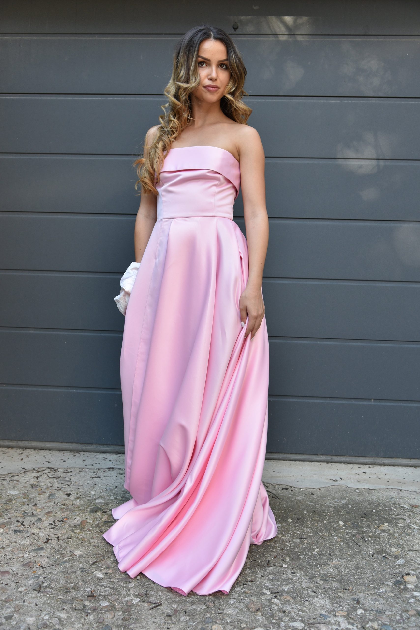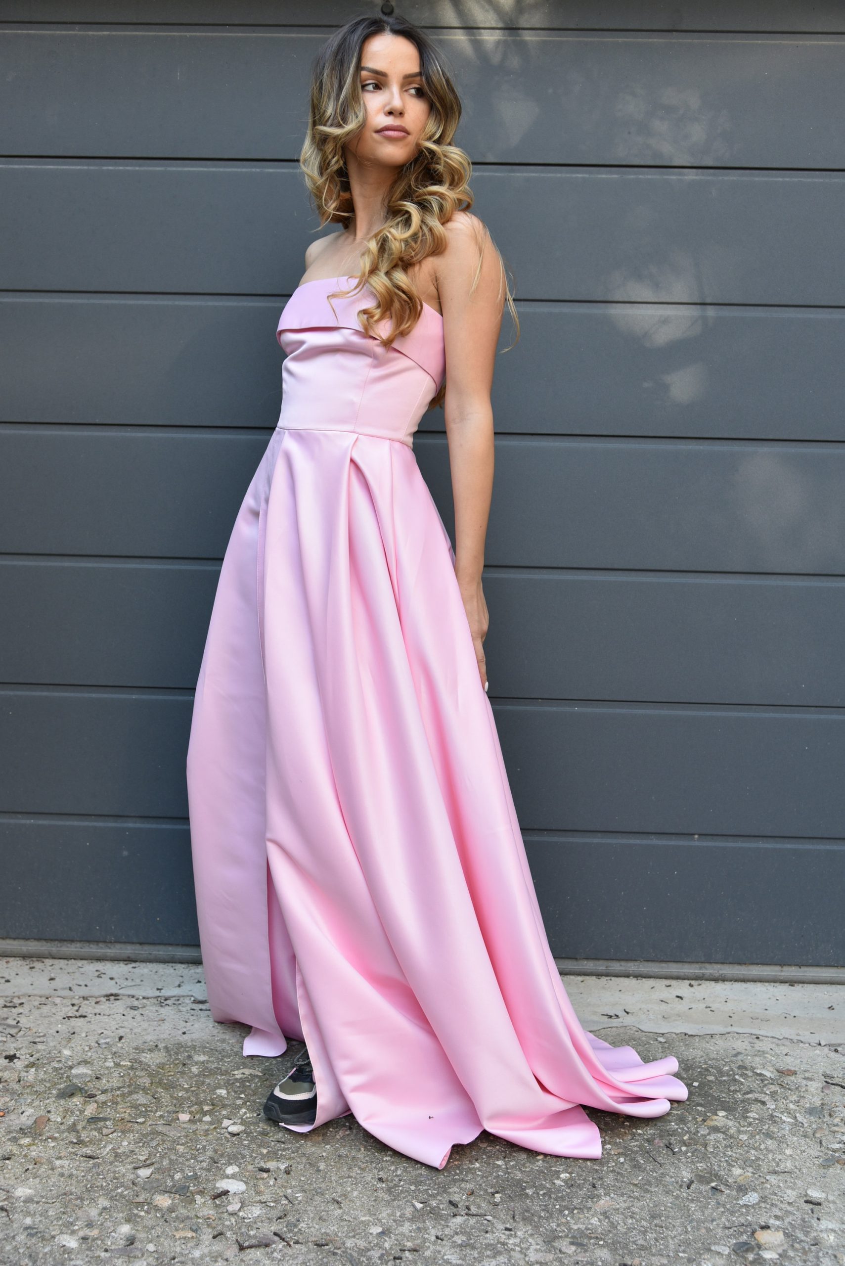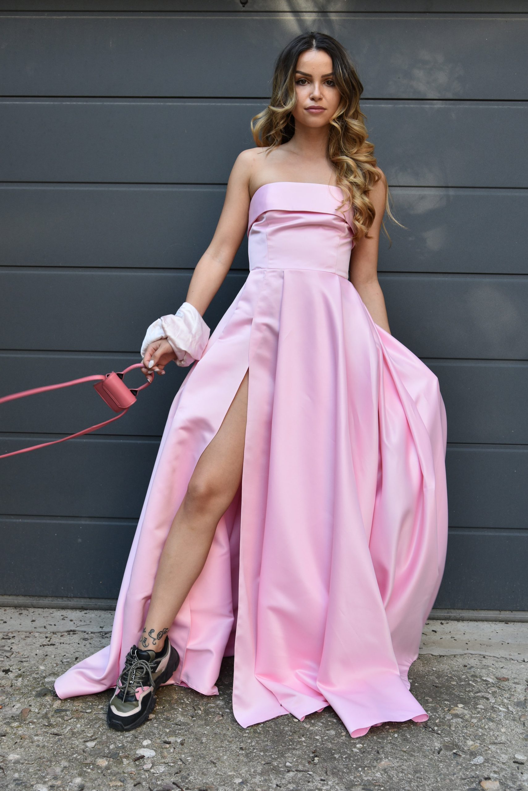Make an entrance in this pink strapless satin maxi dress, designed with a structured bodice and a dramatic high slit for a confident, show-stopping silhouette. The smooth satin finish catches the light beautifully, while the corset-inspired waist shaping creates a clean, snatched look. A statement bow tie detail adds a playful touch, balancing elegance with modern attitude—perfect for formal events, parties, gala nights, and photo-ready moments.