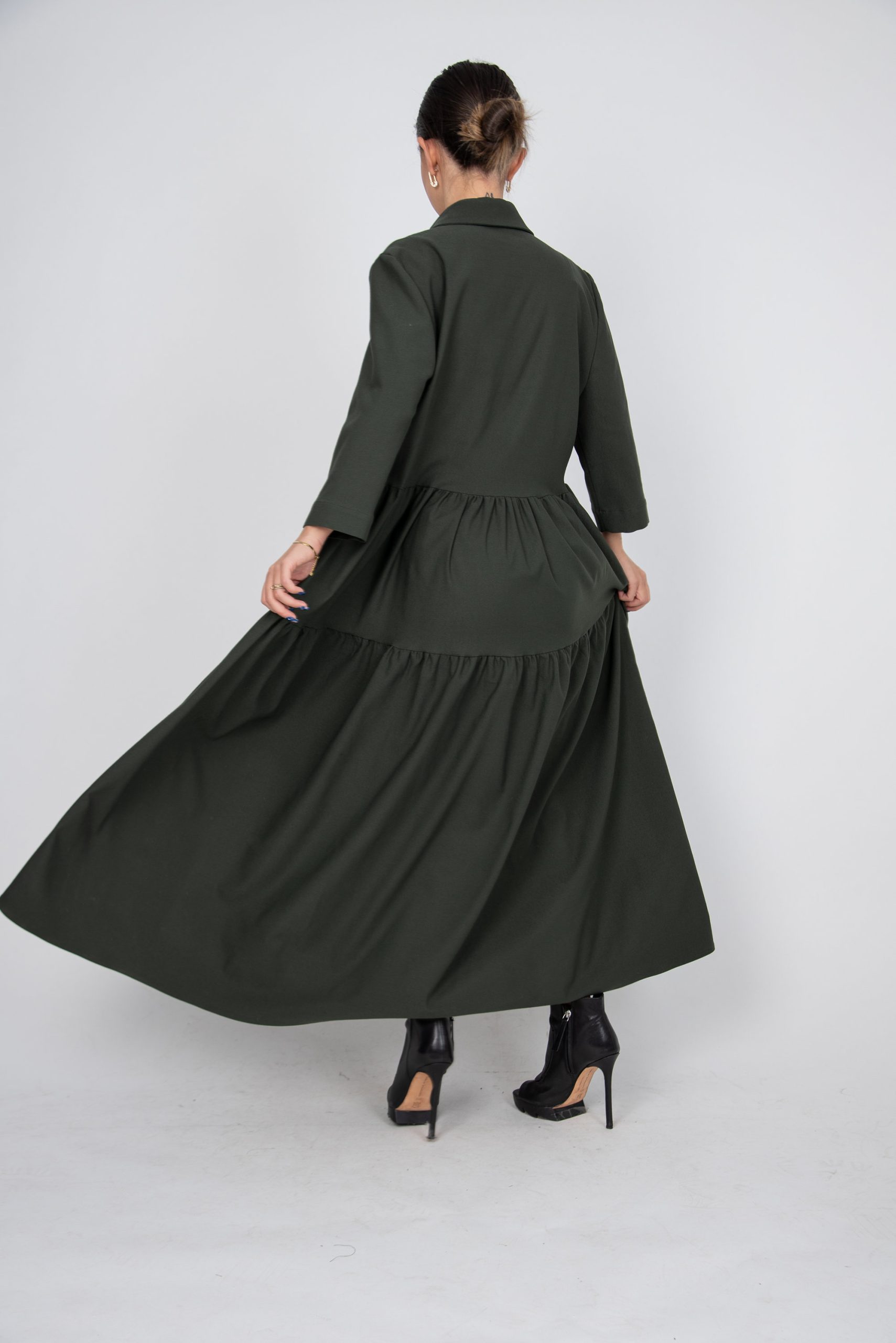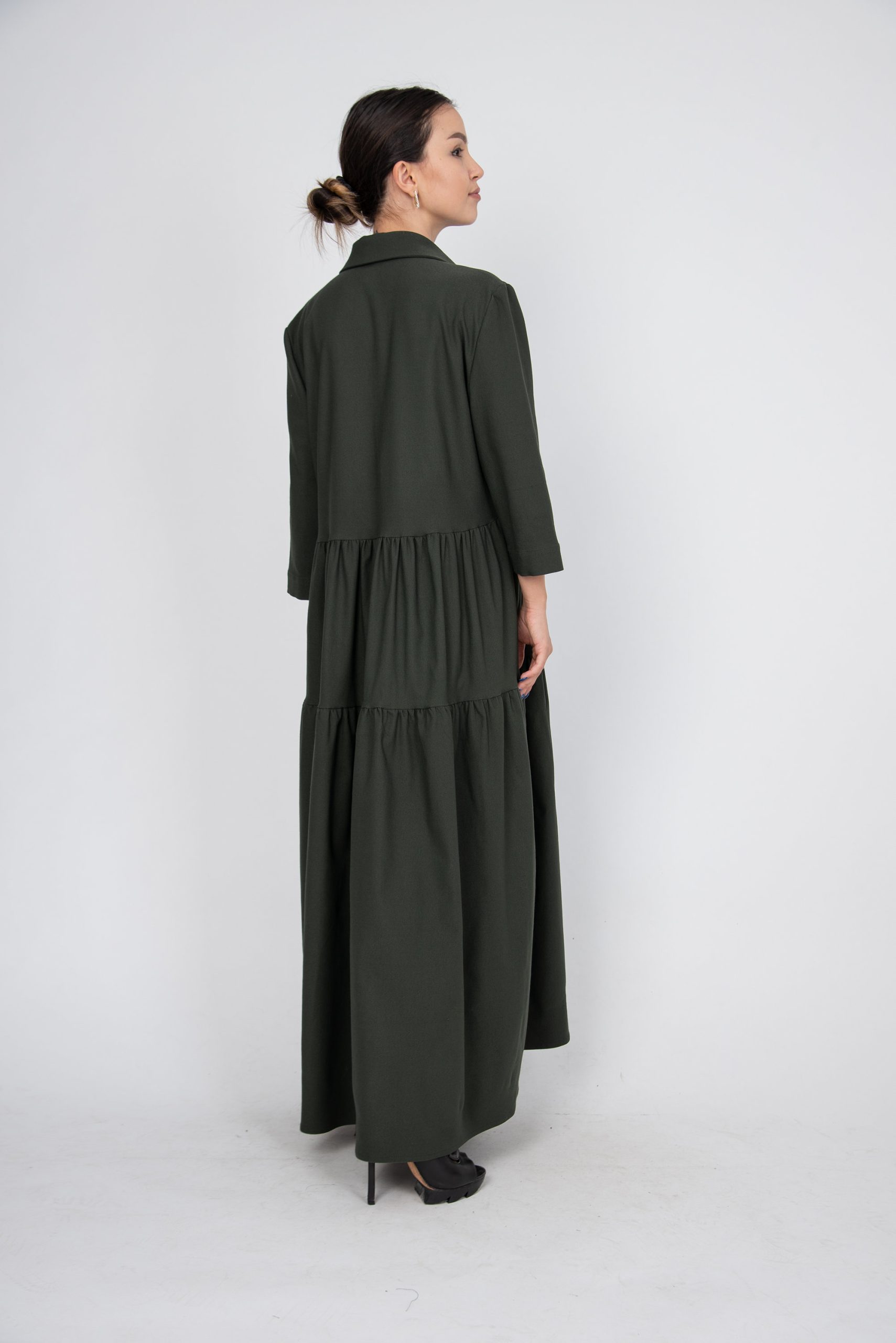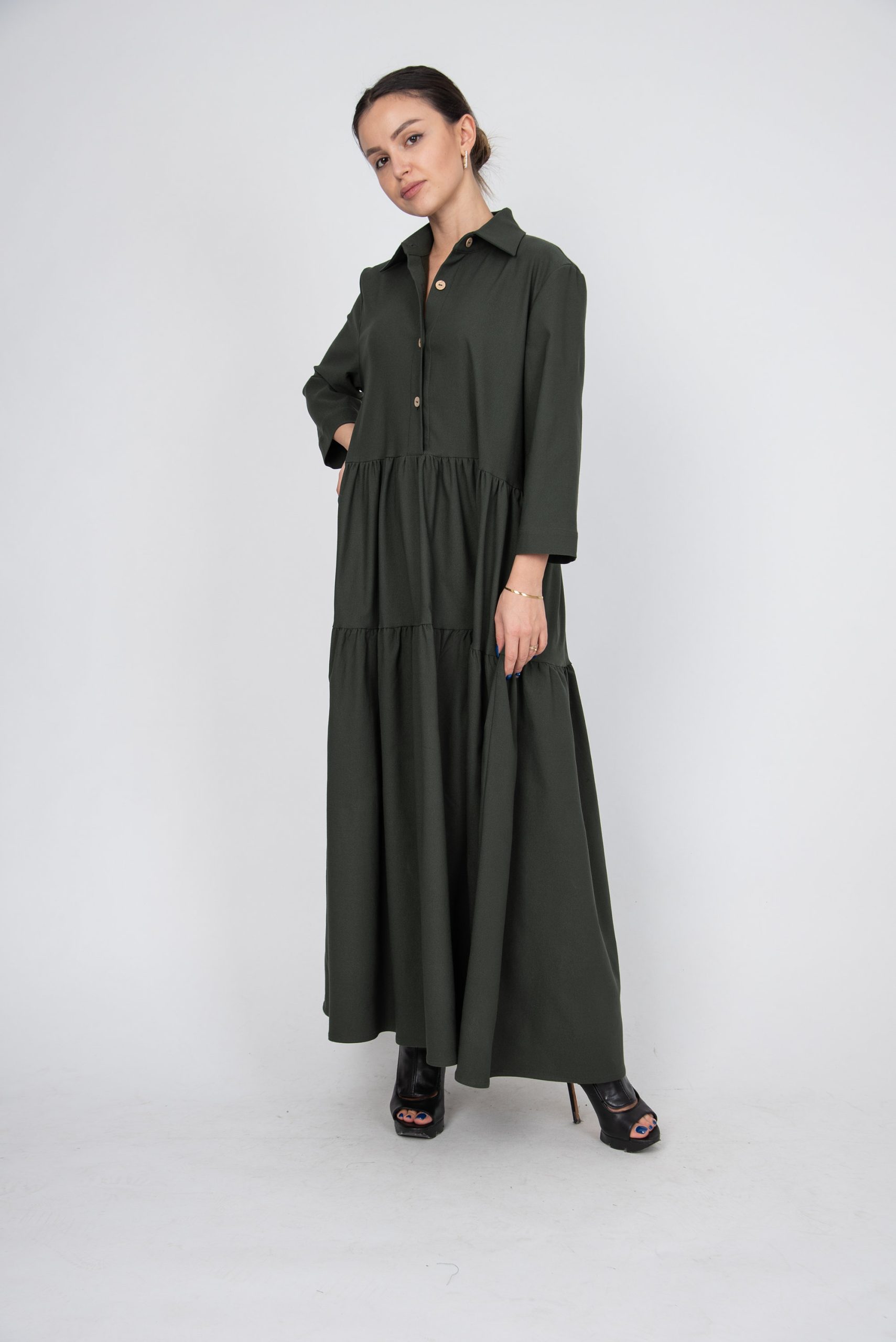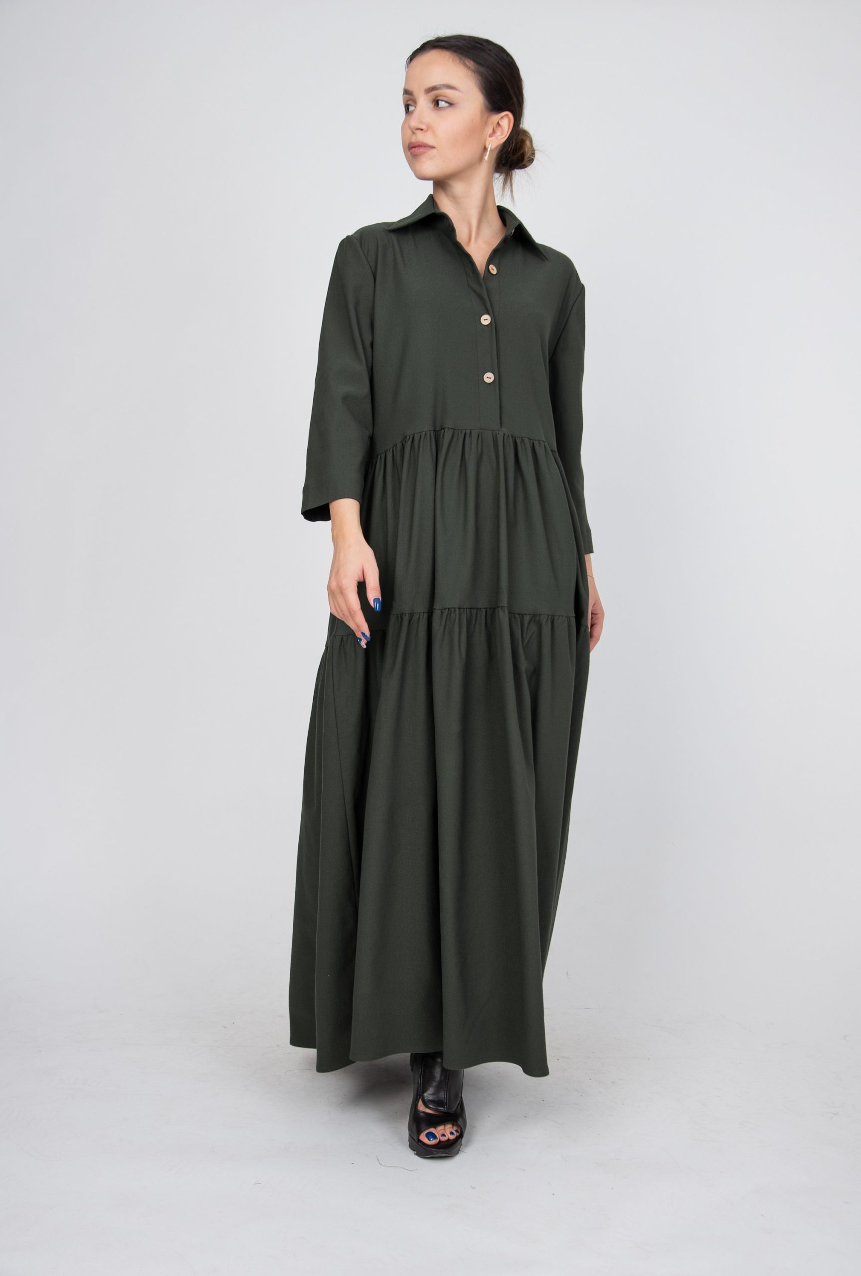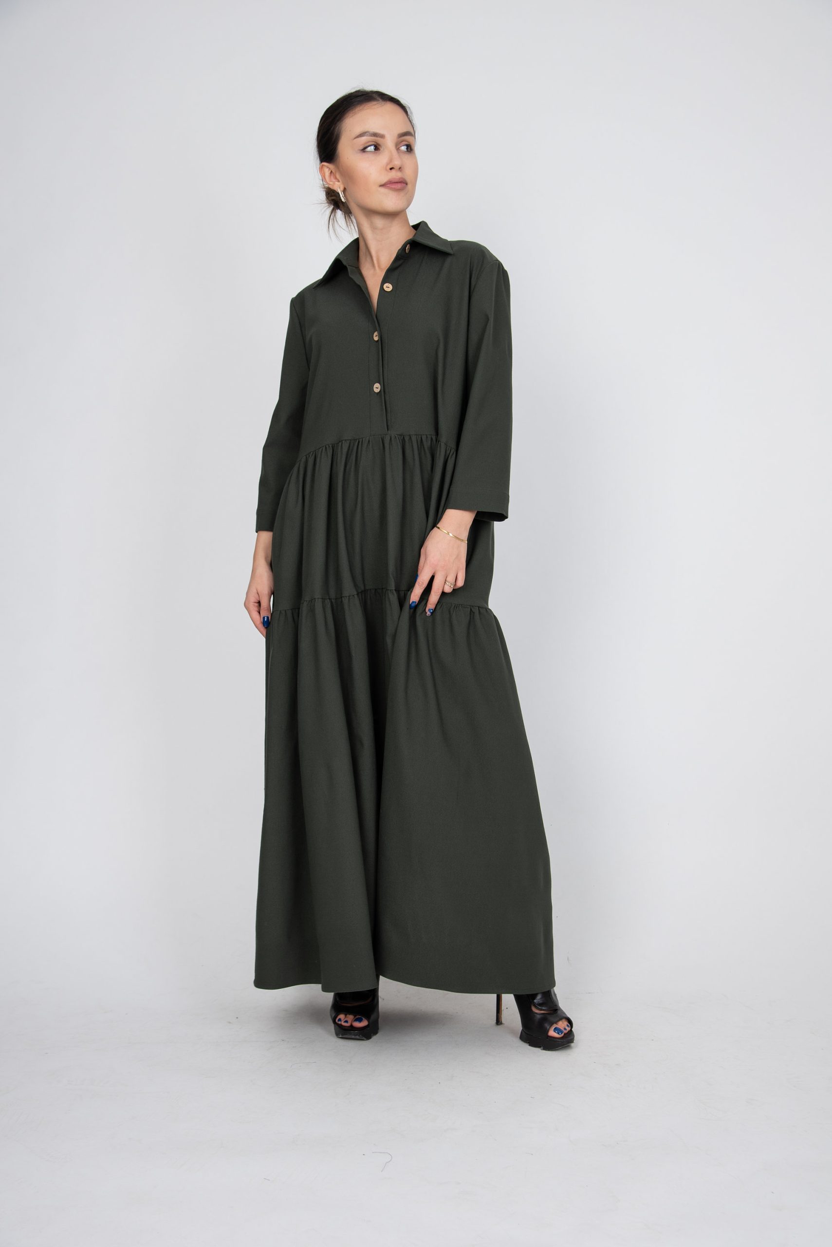 Be the first to review “Olive Green Button-Up Maxi Dress – Tiered Skirt, Loose Fit, Minimalist Shirt Dress”