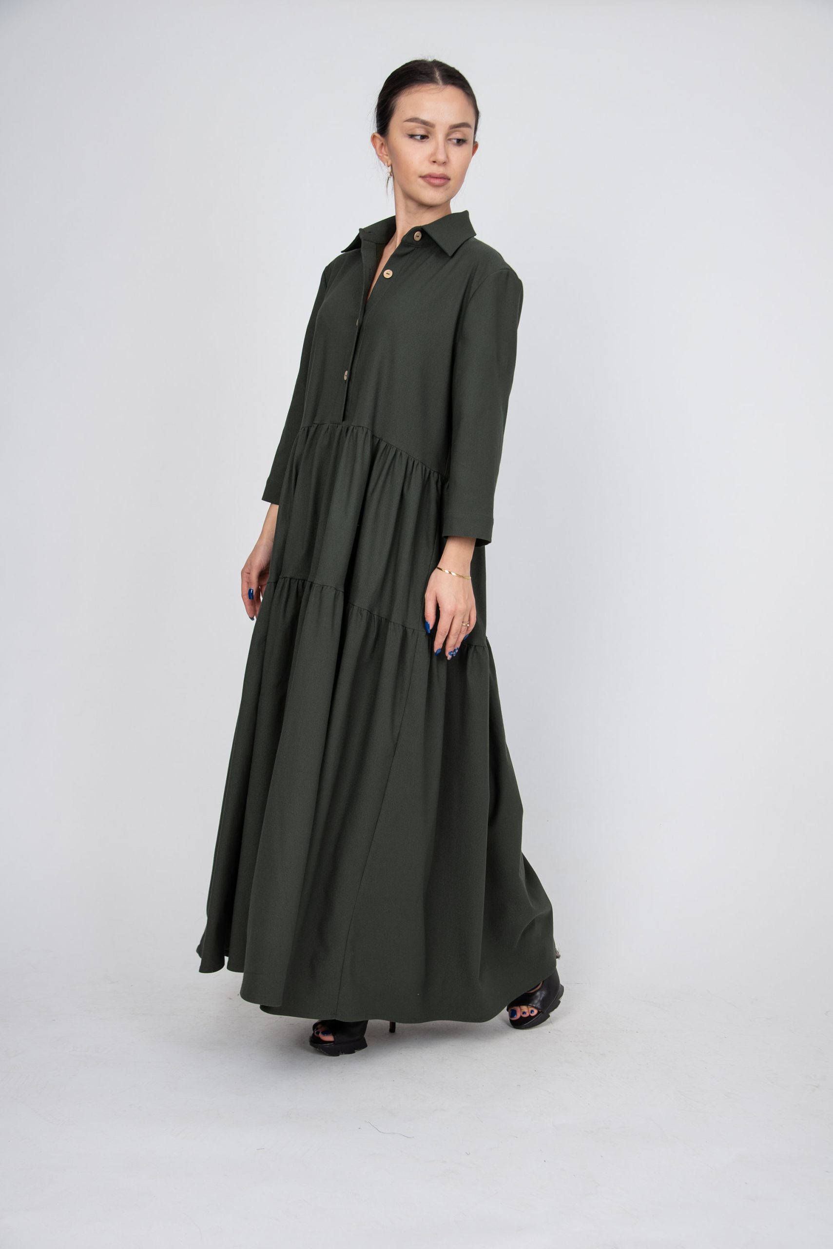 Olive Green Button-Up Maxi Dress – Tiered Skirt, Loose Fit, Minimalist Shirt Dress